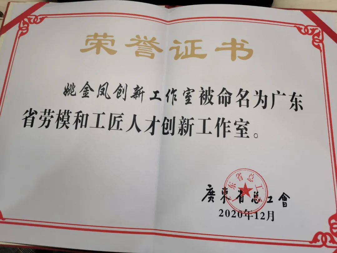 喜讯!姚金凤立异事情室获得“广东省劳模和工匠人才立异事情室”命名